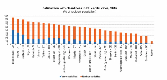 La polul opus, capitalele europene cele mai mulţumite de curăţenia acestora sunt Luxemburg (95%), Viena (90%), Liubliana (88%), Riga (81%) şi Helsinky (80%).