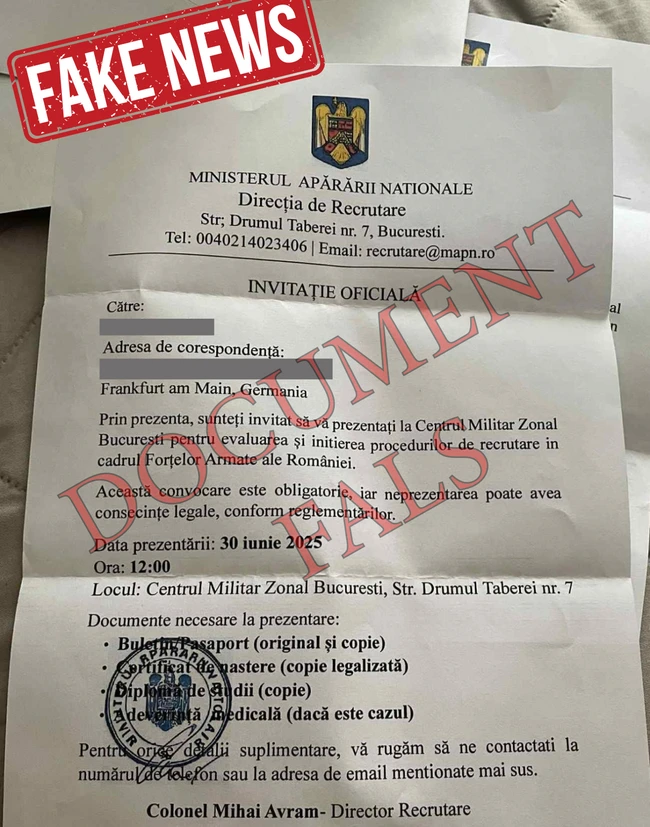 Ministerul Apărării Naționale (MApN) a transmis joi un comunicat prin care avertizează asupra unei tentative de manipulare care are ca scop dezinformarea cetățenilor români stabiliți în străinătate. Mai mulți români au semnalat faptul că au primit, prin poștă, un document falsificat, ce pare a fi emis de autorități militare și care le solicită prezentarea la centre de recrutare din România pentru începerea unor presupuse proceduri de încorporare în Forțele Armate.
