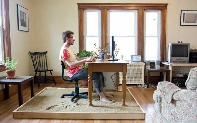 Justin Kemp, 30 de ani, şi-a intitulat proiectul „Surfing with the Sand Between my Toes“. Realizarea e simplă. Cutia de lemn nu este goală, ci parchetul este protejat de o bucată de plastic. Apoi se toarnă nisipul şi se aşază biroul şi scaunul. Va fi mai dificil să ne mişcăm cu scaunul, dar măcar vom avea nisip pe tălpile noastre.