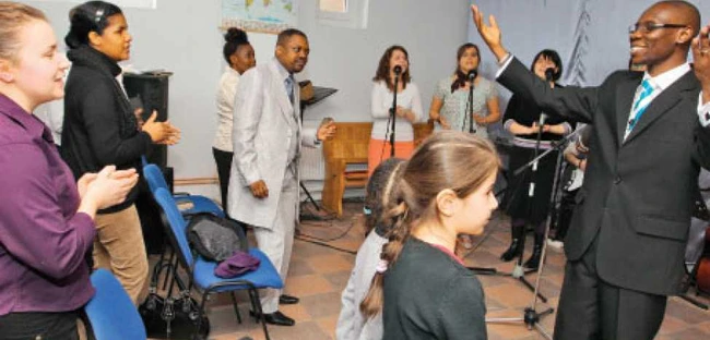 Instrumentele muzicale tronează în capul sălii din subsolul clădirii, iar oamenii îşi înalţă cântecele alături de pastorul lor. Rând pe rând, desemnaţi de conducătorul slujbei, credincioşii se ridică şi spun rugăciuni încropite pe moment, fiecare pe limba lui, în română, engleză sau în diferite dialecte africane. „Să ne ridicăm şi să ne rugăm", îndeamnă pastorul, în limba română, iar apoi în limba engleză.