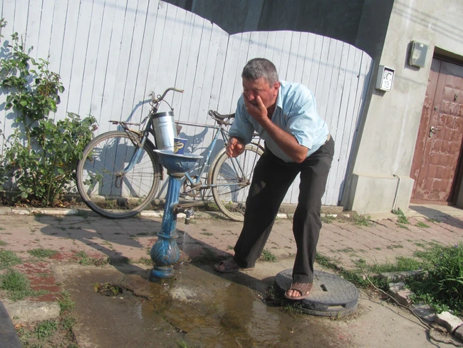 După ce a pedalat doar câteva străzi sub soarele arzător, Ion Stancu (69 de ani) se opreşte la o altă cişmea din drum ca să bea apă. Bărbatul cere un pahar de la un magazin de pe stradă şi trage câteva înghiţituri zdravene, după care se spală pe faţă şi pe mâini cu apa rece ca gheaţa. De ani buni a renunţat să considere berea rece servită la terasa din centrul cel mai bun remediu împotriva caniculei.