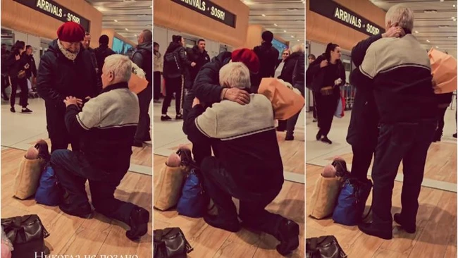 Video Inimi reunite: Un bărbat și-a cerut iubita din tinerețe de soție, după 45 de ani de despărțire. Imaginile de la Aeroportul Chișinău au devenit virale