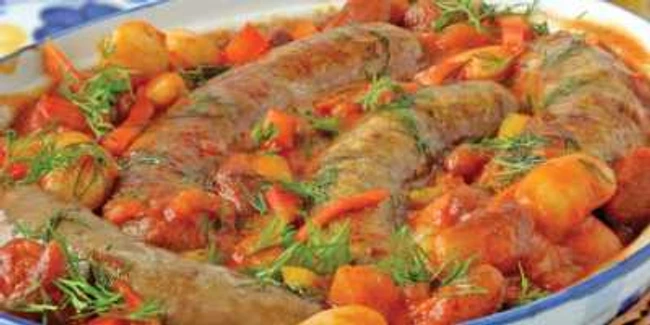 2 Se condimentează cu ierburi aromate, sare şi piper, după gust, şi se stropesc cu ulei. Deasupra legumelor se aşază cârnaţii, înţepaţi în câteva locuri sau crestaţi uşor.