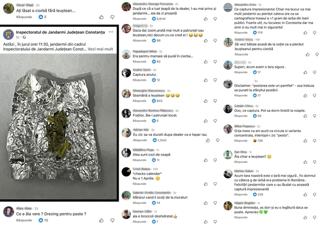 „Zilele trecute, o postare referitoare la o constatare a jandarmilor constănțeni, în care a fost depistată o persoană având asupra sa o cantitate foarte mică de substanțe interzise, a stârnit numeroase reacții și ironii în mediul online. Am citit comentariile și am înțeles tonul glumeț al multora dintre ele. Da, cantitatea este mică. Poate părea nesemnificativă. Poate semăna, la prima vedere, cu «o frunză de leuștean», așa cum s-a ironizat. Dar dincolo de orice aparențe, trebuie să ne amintim un lucru esențial: indiferent de formă sau de cantitate, substanțele interzise rămân un pericol real! O cantitate mică poate ajunge la un copil - copilul meu, copilul tău, copilul oricăruia dintre noi. Poate fi suficientă pentru a face rău. (...) Pentru unii, poate fi doar «o frunză de leuștean». Pentru noi, este un pericol real la adresa celor pe care avem obligația să îi protejăm”, a transmis Jandarmeria.