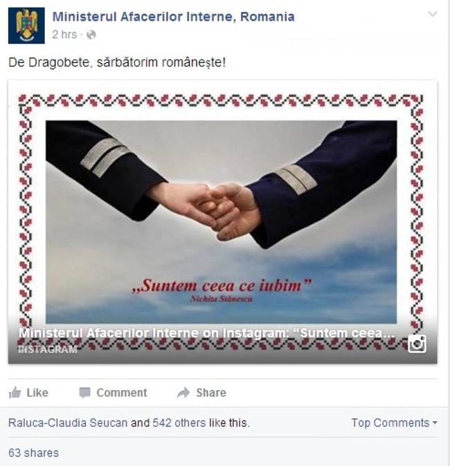 Ministerul de Interne a postat pe Facebook o fotografie însoţită de un mesaj de Dragobete, citându-l pe Nichita Stănescu.