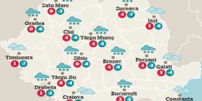Valorile maxime vor fi cuprinse între -3 şi 5 grade, iar cele minime, în general între -8 şi 0 grade. Cerul va fi noros în jumătatea de vest a ţării - unde vor cădea precipitaţii sub formă de lapoviţă şi de ninsoare - şi variabil, mai mult noros, noaptea, în restul teritoriului, când, pe arii restrânse, va ninge slab.