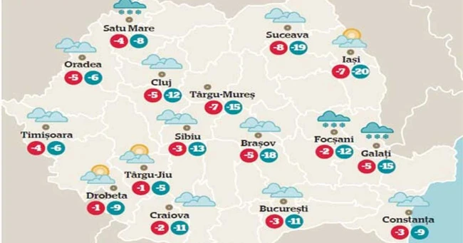 Temperatura, în creştere. Dacă nucleul depresionar din nordul continentului se va deplasa spre est şi va cuprinde Peninsula Scandinavică, Ţările Baltice, vestul şi nordul Rusiei, în restul continentului presiunea va continua să crească. Aşa că la noi vremea se va menţine rece. Cerul va fi ceva mai noros în vest şi în nord, unde mai ales noaptea va ninge slab. Maximele vor fi cuprinse între -4 şi 6 grade, izolat mai ridicate în Banat, iar minimele, între -10 şi 0 grade.