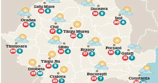 vremea va fi tot caldă pentru această dată. Cerul variabil ziua se va înnora treptat spre seară şi noaptea în estul ţării la munte, unde cu totul izolat va ploua slab. Vântul va sufla ceva mai tare la munte. Temperaturile maxime vor fi cuprinse între 12 şi 21 de grade, cu cele mai ridicate valori în sud, iar cele minime, în general, între -4 şi 6 grade.