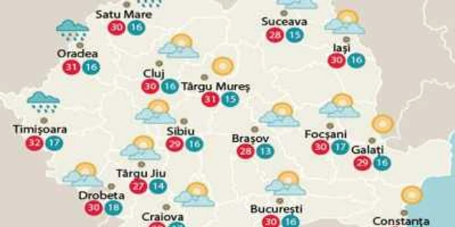 Vremea se va menţine instabilă. Cerul va prezenta înnorări accentuate şi va ploua pe arii extinse în cea mai mare parte a ţării, exceptând sud-vestul. Ploile vor avea caracter de aversă şi chiar torenţial. Izolat, cantităţile de apă vor fi însemnate. Maximele, în scădere îndeosebi în est, vor fi cuprinse între 17 şi 27 de grade.