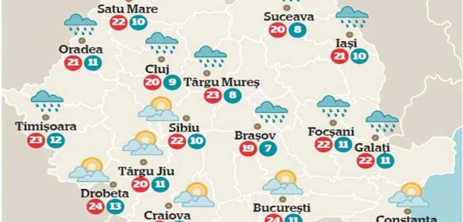 Vremea deosebit de caldă pentru această dată va deveni instabilă începând din vestul ţării. Cerul va prezenta temporar înnorări accentuate şi va ploua pe arii extinse. Ploile, mai ales averse, vor fi însoţite de descărcări electrice şi de intensificări de scurtă durată ale vântului. Local, cantităţile de apă vor fi însemnate. Temperaturile maxime vor fi cuprinse între 18 şi 28 de grade, mai scăzute în vestul extrem.