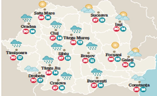 În sud, îndeosebi în bazinul vestic al Mării Mediterane, sunt activi cicloni care determină vremea puternic instabilă. La noi, presiunea în creştere uşoară, distribuită relativ uniform, şi circulaţia slabă vor determina vremea caldă, cu maxime cuprinse între 24 şi 30 de grade, dar şi în general instabilă. Cerul, variabil, mai mult senin în a doua parte a nopţii, va prezenta înnorări mai accentuate, mai ales după-amiaza şi la începutul nopţii, la munte, în vestul, în sudul şi în centrul ţării, unde va ploua local, cu caracter de aversă.