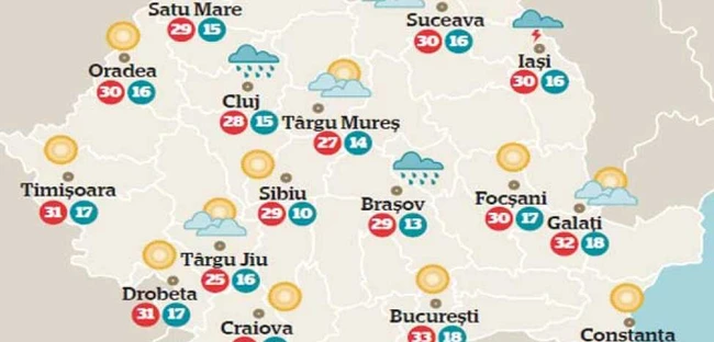 Mâine: Vremea va fi în general instabilă. Instabilitatea atmosferică se va manifesta prin înnorări accentuate şi averse, însoţite de descărcări electrice şi intensificări de scurtă durată ale vântului. Cantităţile de apă pot fi însemnate. Dar, în est şi în sud-est vremea va fi călduroasă. Temperaturile maxime vor fi cuprinse între 20 de grade în Dealurile de Vest şi 31 de grade în Bărăgan şi sudul Moldovei.