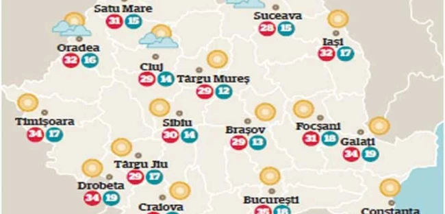 Vremea se va menţine caldă, mai ales în sud, unde izolat va fi caniculară, cu temperaturi maxime cuprinse între 23 şi 33 de grade, mai ridicate în Câmpia Română, unde vor ajunge până la 35 de grade. Cerul variabil, mai mult senin în sud, va fi temporar noros la noapte în nordul, centrul şi estul ţării, unde va ploua slab pe arii restrânse.