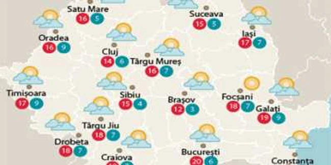 Cerul va fi variabil, mai mult noros, îndeosebi în cursul nopţii în vestul ţării, unde, local, va ploua. În restul teritoriului va ploua cu totul izolat. Vântul, în general moderat, va prezenta intensificări la munte. Temperaturile maxime vor fi cuprinse între 14 şi 22 de grade.