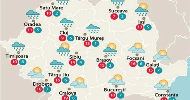 Cerul va fi temporar noros şi va ploua pe arii restrânse, îndeosebi în sudul ţării. Vântul va sufla slab, iar dimineaţa, în zonele joase şi pe văi, local, se va produce ceaţă. Temperaturile maxime vor fi cuprinse între 7 şi 17 grade, iar cele minime între 1 şi 9 grade, mai scăzute în depresiuni.