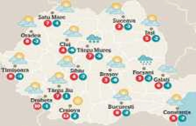 Cerul va fi temporar noros şi trecător vor cădea precipitaţii slabe, mai ales sub formă de ploaie, pe arii restrânse în nordul, centrul şi în estul ţării şi cu totul izolat în restul teritoriului. Vântul, slab în vest, centru şi sud, va sufla moderat în Moldova şi Dobrogea, iar la munte va prezenta intensificări. Temperaturile maxime vor fi cuprinse între 4 şi 14 grade, iar cele minime, între -4 şi 4 grade.