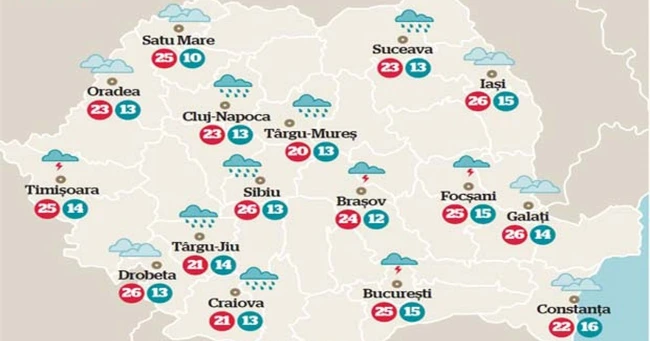 Depresiunea islandeză coborâtă latitudinal se tot extinde şi devine tot mai activă între sudul Groenlandei şi Peninsula Iberică. Numai în vestul continentului şi în bazinul Mării Mediterane presiunea este mai ridicată. La noi, presiunea va scădea, iar un front venit dinspre Europa Centrală va aduce ploaie pe arii extinse în vestul, nordul şi centrul ţării. Ploile, mai ales averse, vor avea caracter torenţial şi vor fi însoţite de intensificări ale vântului care pot lua aspect de vijelie. Cantităţile de apă vor depăşi local 20 de litri pe metru pătrat şi izolat 40 de litri pe metru pătrat. În celelalte zone va ploua local după-amiază. Maximele vor fi cuprinse între 18 şi 27 de grade.