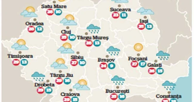 Vremea va fi uşor instabilă la munte, în sudul şi în sud-vestul ţării, unde va ploua. Ploile vor fi însoţite de descărcări electrice şi de intensificări de scurtă durată ale vântului. În rest, vremea va fi predominant frumoasă, cu cer variabil. Temperaturile maxime vor fi cuprinse între 21 şi 28 de grade.