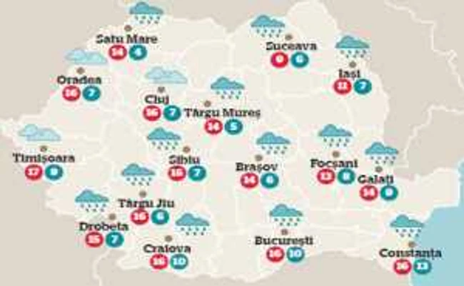 Astfel, Depresiunea Islandeză se află la locul ei de origine şi ocupă nord-vestul continentului, iar în nord-est se menţine aceeaşi zonă depresionară. La latitudinea de 60 de grade nord este un brâu îngust de presiune ridicată, în diminuare treptată. În acelaşi timp, în bazinul central al Mării Mediterane sunt activi cicloni în deplasare uşoară către est şi nord-est, peste Câmpia Panonică. La noi, vremea se va menţine rece, cu maxime ziua, cuprinse între 9 şi 17 grade, şi minime, în general, între 4 şi 13 grade. Cerul va fi mai mult noros şi, local, va ploua. În zona înaltă de munte, precipitaţiile vor fi şi sub formă de lapoviţă sau ninsoare. Vântul va sufla slab până la moderat, cu unele intensificări la munte şi în sud-vest.