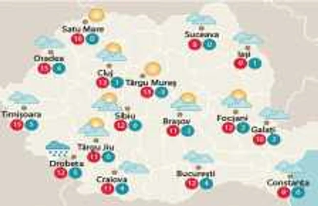 Cerul variabil va fi ceva mai noros în sudul şi în centrul ţării, unde vor fi condiţii de ploaie slabă sau burniţă. Vântul va sufla în general slab în centrul ţării şi moderat în zonele extracarpatice şi în Banat. Dimineaţa, în zonele joase şi adăpostite, izolat se va produce ceaţă. Temperaturile maxime vor fi cuprinse între 8 şi 16 grade.