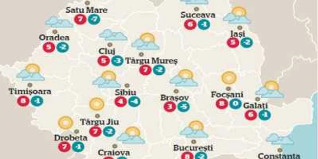 Vremea va fi rece pentru această dată, cu temperaturi maxime cuprinse între 0 şi 10 grade şi minime, între -9 şi 0 grade, mai coborâte în depresiuni, spre -12 grade. Cerul variabil va fi ceva mai noros, în estul şi în sudul ţării, unde izolat sunt posibile precipitaţii slabe.