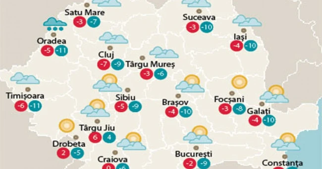 Cerul va fi temporar noros şi, pe arii restrânse, va ninge slab în nordul şi în centrul ţării, iar noaptea, şi în sud. Vântul slab şi moderat va prezenta unele intensificări în zona înaltă de munte. Temperaturile maxime vor fi cuprinse între -4 şi 6 grade, iar cele minime de dimineaţă, între -10 şi 0 grade.