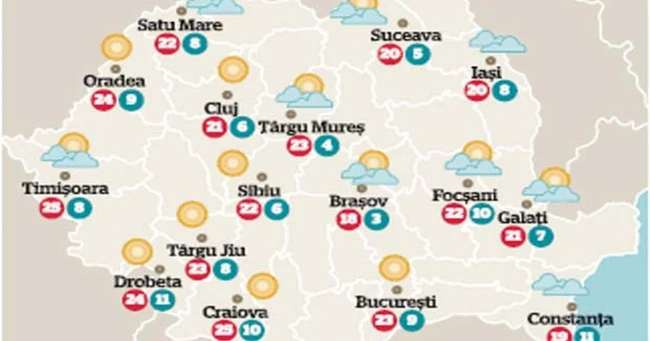 Vremea va fi predominant frumoasă şi uşor mai caldă decât ziua anterioară. Cerul va fi variabil, mai mult senin în zonele înalte, dar, dimineaţa, izolat, vor fi condiţii de ceaţă în depresiuni şi în zonele joase din interiorul Arcului Carpatic. Temperaturile maxime vor fi cuprinse între 19 şi 28 de grade.