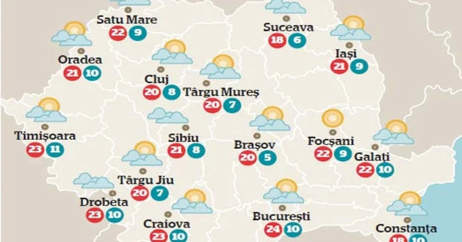 Din acesta, spre est, peste Europa Centrală se va extinde o prelungire până în vestul Câmpiei Ruse, care va despărţi două regiuni cu presiune scăzută, una la nord şi alta la sud, unde nucleul din zona Angliei va coborî până în bazinul vestic al Mării Mediterane, iar cel din Ţările Baltice se va deplasa spre est. În acelaşi timp, în Câmpia Panonică se va forma un nucleu ciclonic. Şi la noi, presiunea va scădea, iar circulaţia sudică va aduce aer mai cald, dar şi mai mulţi nori în jumătatea vestică a ţării, unde instabilitatea vremii va fi mai accentuată şi se va manifesta prin averse însoţite de descărcări electrice şi de intensificări ale vântului, pe arii relativ extinse în Banat, Crişana, Maramureş şi, local, în Transilvania şi Oltenia. În rest, va ploua local. Temperaturile maxime vor fi cuprinse între 14 grade pe litoral şi 25 de grade în Lunca Dunării.