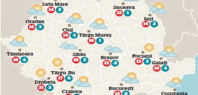 În restul continentului, de la Marea Mediterană până în nordul Peninsulei Scandinavice, presiunea este în creştere continuă, numai că, la înălţime, în vestul bazinului Mării Mediterane este o masă de aer mai rece, care determină vremea în general instabilă. Şi la noi presiunea va creşte, iar circulaţia slabă dinspre nord-vest va aduce masă de aer de origine oceanică. Aşa că vremea se va menţine mai caldă decât în mod normal la această dată, cu temperaturi maxime cuprinse, în general, între 11 şi 21 de grade, ceea ce înseamnă cu până la 8-9 grade mai mult decât media multianuală. Cerul va fi ceva mai noros în zona Carpaţilor Meridionali, unde izolat va ploua slab. Mâine dimineaţă, temperaturile minime vor fi cuprinse între -3 şi 7 grade, mai scăzute în depresiuni..