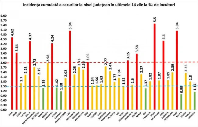 Rata de infectare la nivelul municipiului Bucureşti este în acest moment fiind de 4.24 la mia de locuitori. La Alba, Bihor, Sibiu rata a depăşit 4 la mie, iar în Sălaj, Timiş şi Cluj, 5 la mia de locuitori.