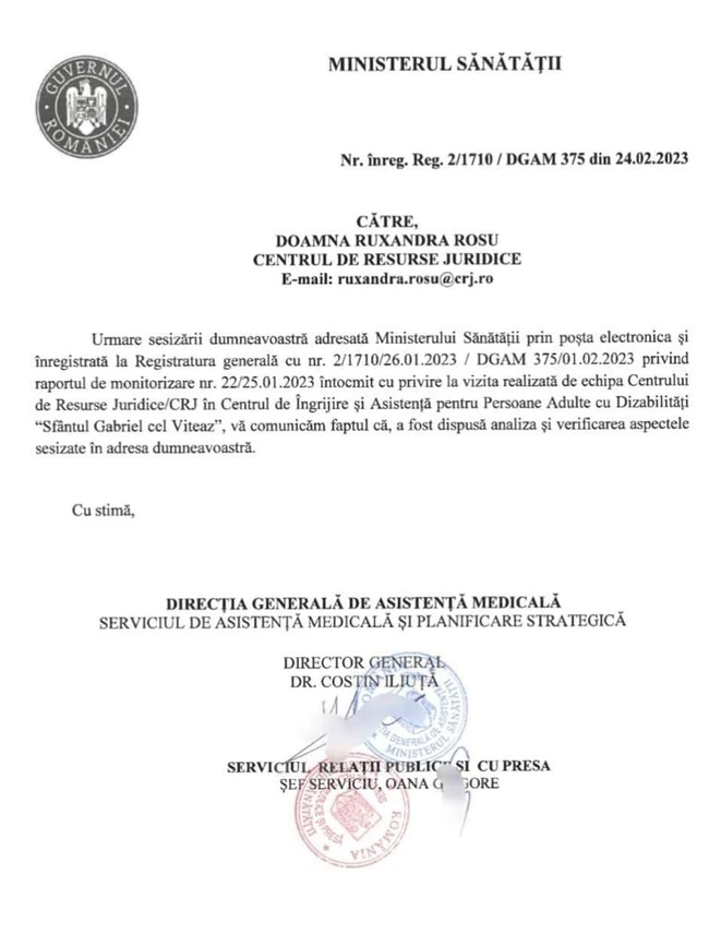 0Centrul pentru Resurse Juridice a publicat un document care arată că în luna ianuarie anul acesta Ministerul Sănătății a răspuns unei sesizări referitoare la situația din Centrul de îngrijire și asistență pentru persoanele adulte cu dizabilități ”Sfântul Gabriel cel Viteaz”, unul dintre azilele groazei din Voluntari, Ilfov.