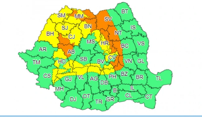 Alerta cod portocaliu vizează judeţele Maramureş, Bistriţa Năsăud, Suceava, Neamţ, Harghita, Bacău, Covasna, Vrancea, Buzău, Alba şi Cluj.