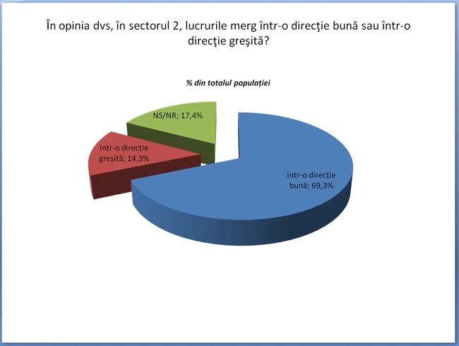 În cadrul aceluiaşi studiu, 69,3% dintre cei chestionaţi au răspuns că lucrurile în Sectorul 2 se îndreaptă într-o direcţie bună, 14,3% au fost de părere că lucrurile în sector se îndreaptă într-o direcţie greşită, în timp ce 17,4% din cei intervievaţi nu au răspuns/nu au ştiut.