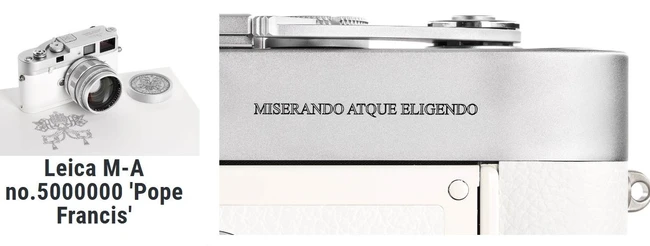 Modelul scos la licitație, un Leica M-A realizat într-o ediție unică, se remarcă prin designul său alb, o trimitere directă la veșmintele papale, și prin detaliile gravate special pentru Papa Francisc. Aparatul poartă motto-ul personal al acestuia, „Miserando atque Eligendo” („S-a îndurat de el și l-a ales”), precum și stema Vaticanului, integrate în finisajele cromate și în stratul special de acoperire.