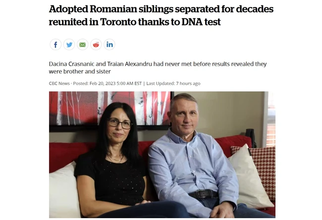Dacina Crasnanic și Traian Alexandru nu s-au întâlnit niciodată până când au făcut independent testele ADN 23andMe, cu speranța de a afla mai multe despre istoricul de sănătate al familiei lor, relatează cbc.ca.