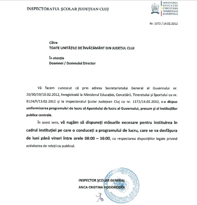 Sindicaliştii din învăţământ au reacţionat vehement după ce a apărut o adresă a Inspectoratului Şcolar Judeţean Cluj în care li se comunica directorilor de şcoli circulara SGG cu programul uniformizat de lucru al bugetarilor.