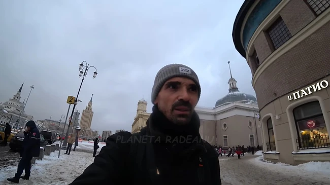 Ajuns într-o stație importantă de metrou, cu trei gări deasupra, lucrare a arhitectului rus Alexei Șciusev din Moldova, vloggerul a abordat un tânăr rus.