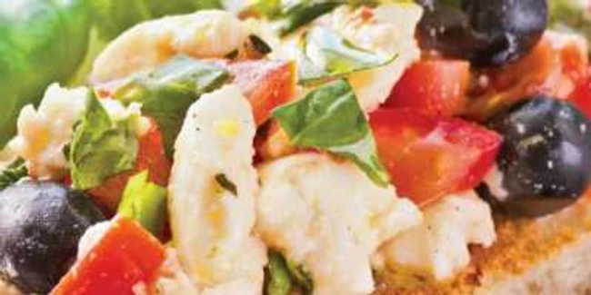 3 Se scoate pâinea din cuptor şi se freacă fiecare felie cu usturoi. Se pune amestecul de brânză, măsline şi roşii pe bucăţile de pâine. Se decorează cu frunzuliţe de oregano sau pătrunjel.