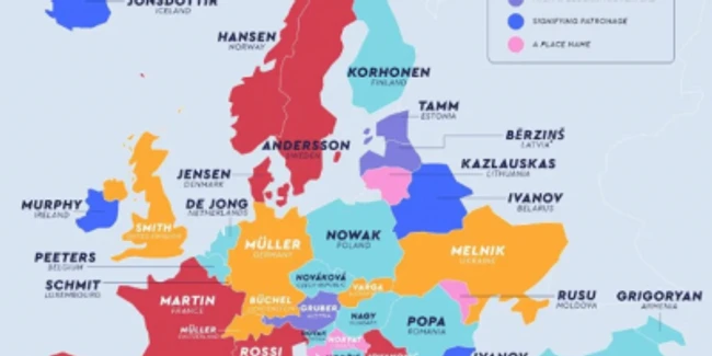 În Europa, cele mai frecvente nume de familie provin de la ocupaţii şi profesii, din derivate de la numele tatălui (Johnson de la John’s son şi Jones, spre exemplu) sau forme de relief (Munteanu, Câmpeanu, Bush etc.)