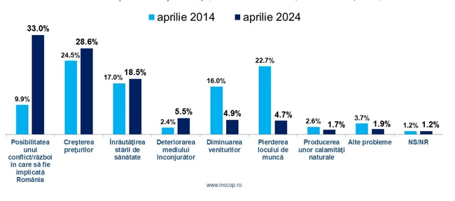 "33% dintre români sunt îngrijorați cel mai mult de posibilitatea unui conflict/război în care să fie implicată România (comparativ cu 9,9% în mai 2014), în timp ce creșterea prețurilor este menționată de 28,6% (față 24,5% în mai 2014). Înrăutățirea stării de sănătate reprezintă cea mai importantă sursă de îngrijorare pentru 18,5% dintre cei intervievați (față de 17% în mai 2014). 5,5% dintre români sunt îngrijorați cel mai mult de deteriorarea mediului înconjurător (2,4% în mai 2014), 4,9% de diminuarea veniturilor (16% în mai 2014), 4,7% de pierderea locului de muncă (22,7% în mai 2014), 1,7% sunt îngrijorați de producerea unor calamități naturale (2,6% în mai 2014), iar 1,9% de alte probleme (3,7% în mai 2014). 1,2% nu știu sau nu răspund la această întrebare", arată INSCOP.