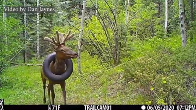 Autoritatea pentru Parcuri şi Faună Sălbatică din Colorado a indicat că anvelopa a ajuns în jurul gâtului elanului când acesta era mai tânăr şi nu avea coarne, sau în timpul iernii, când masculii îşi schimbă coarnele.