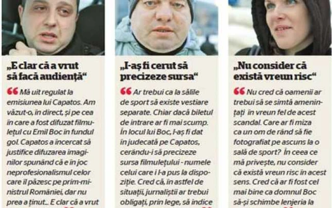 0Plecând de la cazul difuzării filmuleţului cu Emil Boc în fundul gol, luni seară, la emisiunea „Un show păcătos", de pe canalul Antena 1, ziarul „Adevărul" a întrebat mai multe persoane cu imagine publică dacă se vor teme, de-acum înainte, că vor fi fotografiate în vestiare, în ipostaze intime.