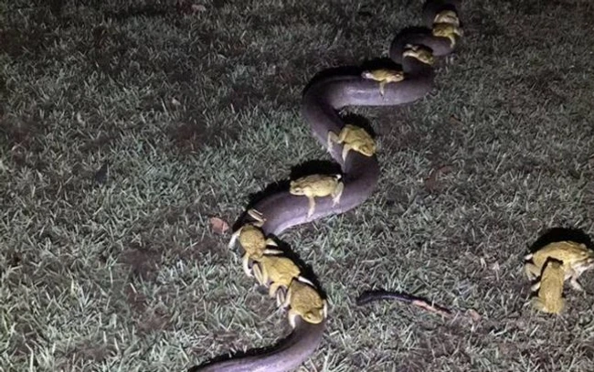 0Cel puţin zece broaşte râioase au fost filmate în timp ce stăteau pe spatele unui şarpe de mari dimensiuni. Înregistrarea, care s-a viralizat, a fost făcută în vestul Australiei, după ploi masive.