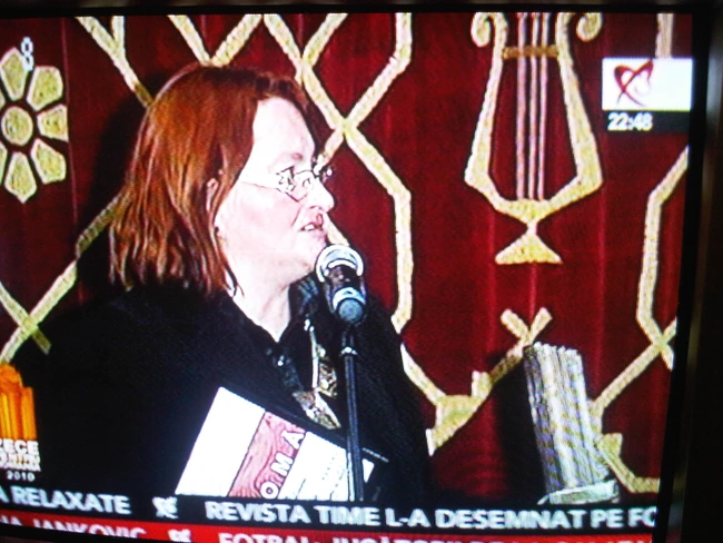Prezentatorul Mihai Tatulici a întrerupt-o şi a invitat-o să coboare de pe scenă. Femeia a plecat cu tot cu trofeu.