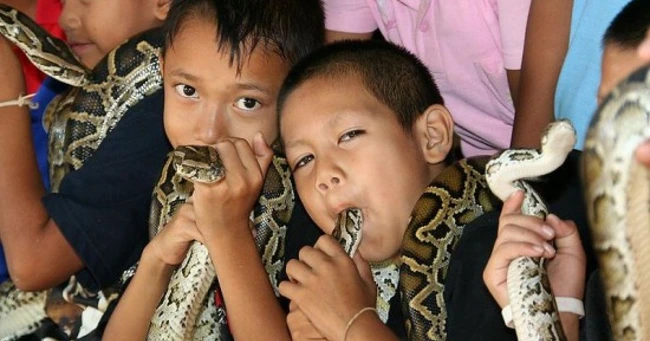 Şerpi de toate speciile – de la cele veninoase, cum ar fi cobra regală sau şarpele cu ochelari, şi până la cele mai puţin periculoase, de tipul pitonilor – sunt crescuţi de locuitorii acestui sat în cutii de lemn şi consideraţi membri ai familiei.