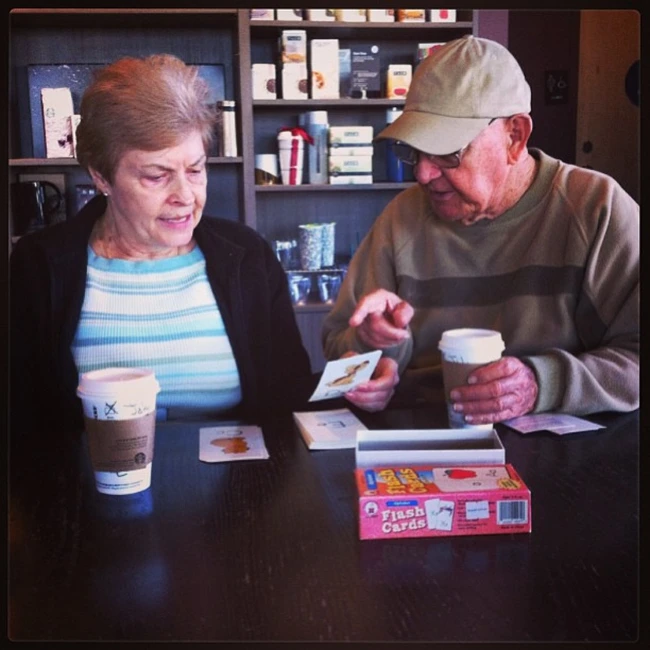 Imaginea a fost postată joi, cu explicaţia: „stăteam lângă acest cuplu la Starbucks azi-dimineaţă, acel bărbat, John, o învăţa pe Linda alfabetul. Ne-a spus că femeia îşi pierduse memoria şi învăţa din nou să citească. Un moment simbolic de răbdare, dragoste şi înţelegere”, scria utilizatorul „sho3”.