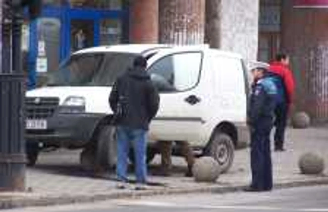 0Maşina pe trotuar suspendată pe o piatră de mobilier urban
