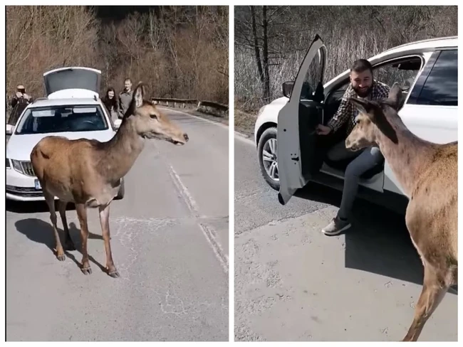 Căprioara îi aşteaptă pe şoferi în apropierea drumului naţional, îi face să oprească şi să îi dea ceva de mâncare.