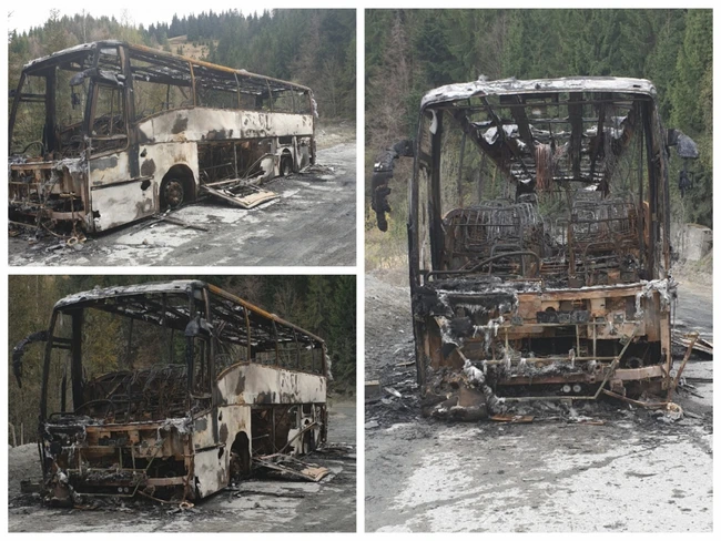 FOTO Cum arată un autobuz cuprins de flăcări în timp ce transporta muncitori. Oamenii s-au salvat, iar maşina e un morman de fiare vechi