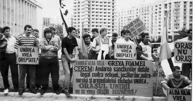 Fotografia document publicată în ziarul local “Vestea” din Alba Iulia surprinde fotbaliştii de la Unirea, în 1992, împreună cu antrenorul Cornel Ţălnar, în greva foamei la Bucureşti, protestând împotriva sancţiunilor dictate de federaţie după scandalul “haina de blană”. Printre aceştia se afla şi Ioan Mărginan (Limoniu), în prezent preşedinte al Universităţii Cluj. Pe pancardele purtate de protestatari se poate citi: “Unirea vrea dreptate!”, “Jucătorii trebuie să joace pentru că au fost corecţi”, “Greva Foamei. Cerem: anularea sancţiunilor dictate ilegal contra echipei, antrenorului şi preşedintelui clubului Unirea. Oraşul Unirii nu se vrea oraşul dezbinării”.